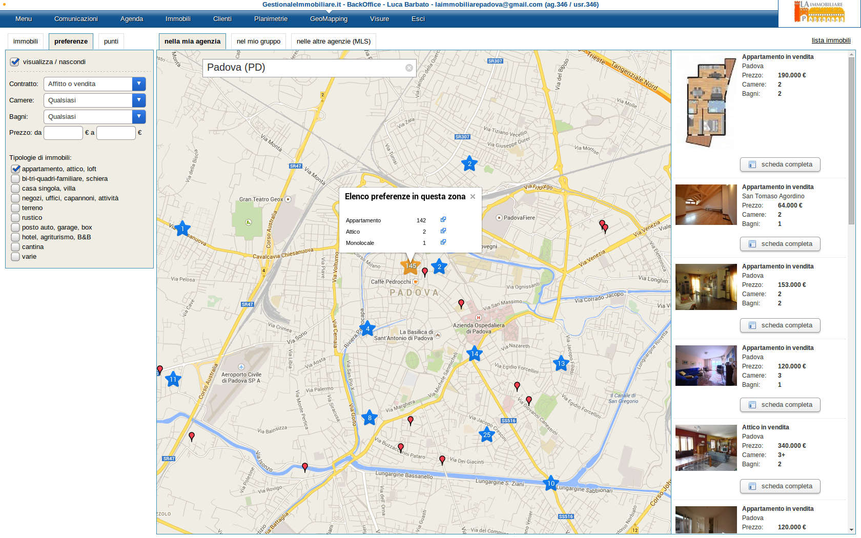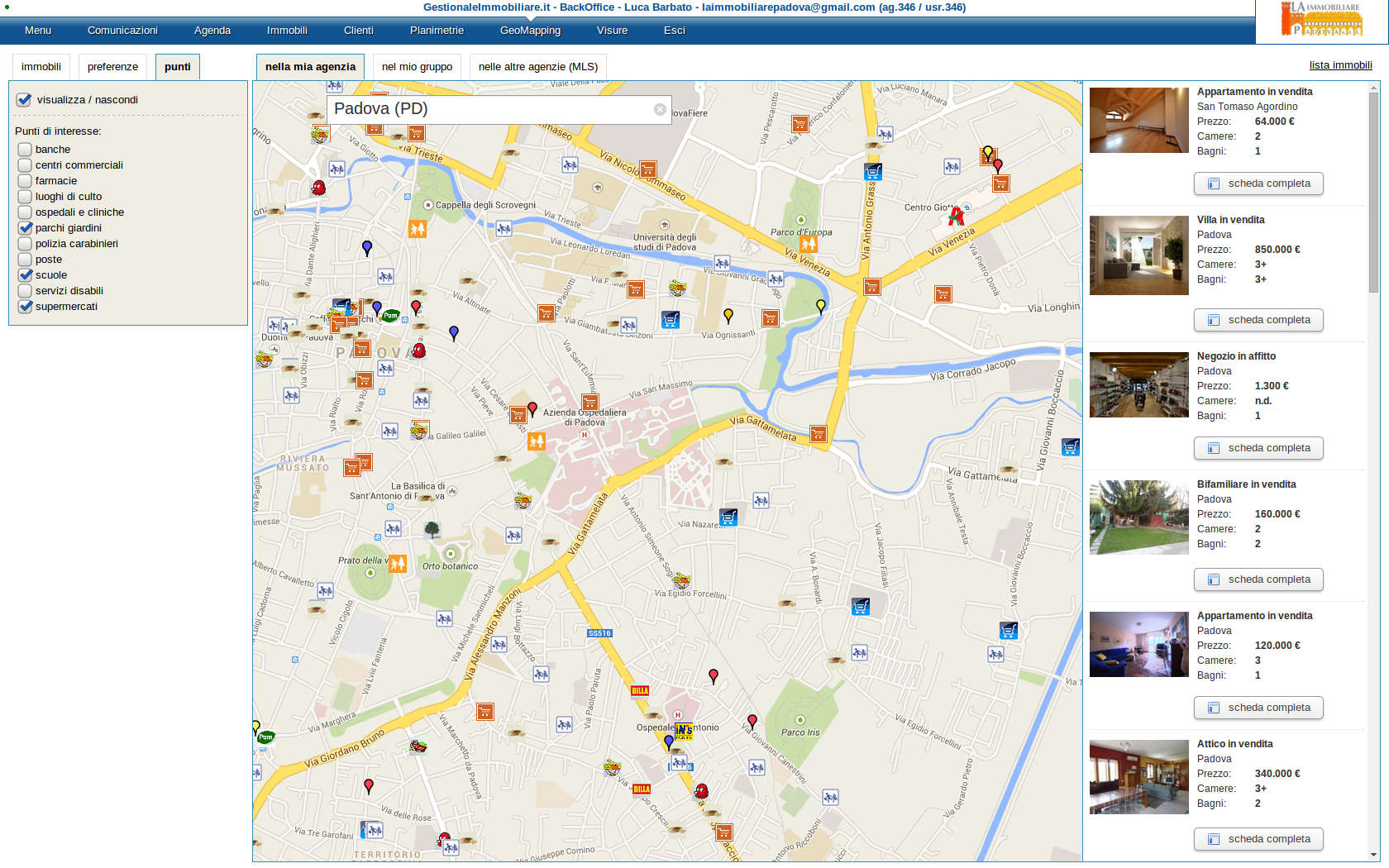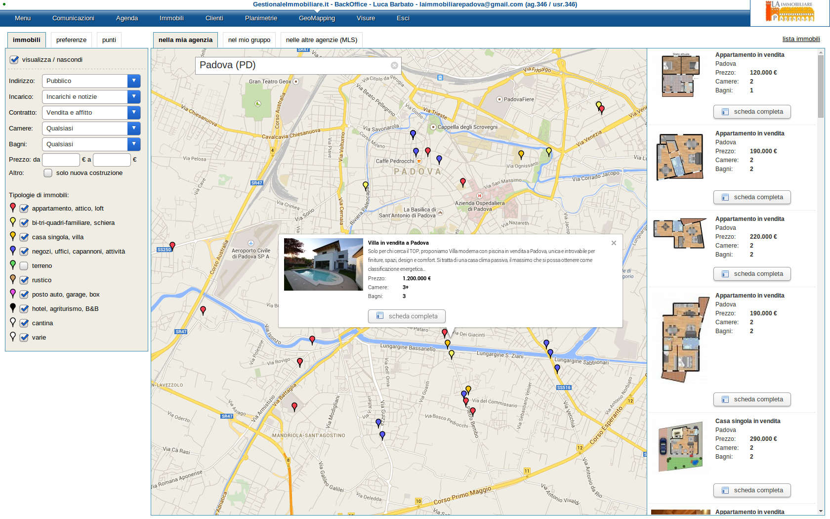 Gestionale Immobiliare ti consente di posizionare i tuoi immobili con precisione sulla mappa e di ricercare con facilità immobili in una determinata zona. Osserva come i tuoi immobili vengono posizionati sulla mappa con diversi colori per ogni categoria, ben distinti nella legenda.
