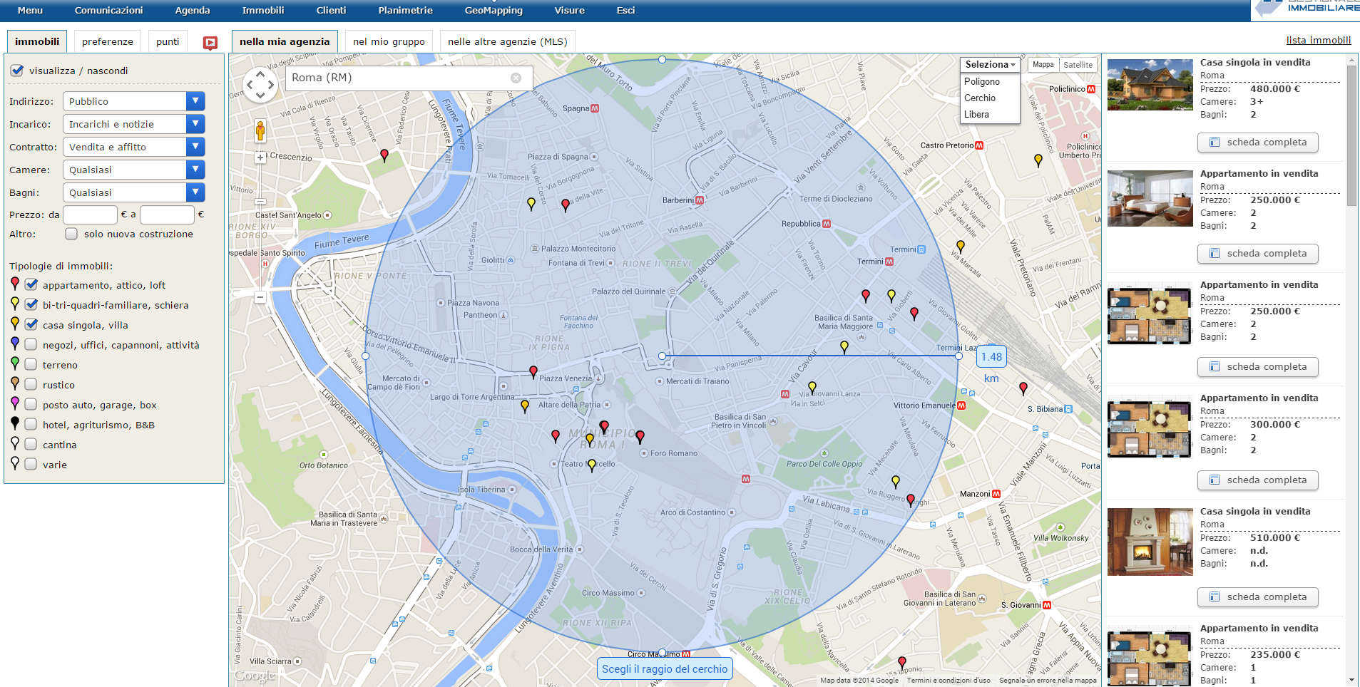 Inoltre, il geomapping ti permette di selezionare gli immobili disegnando direttamente sulla mappa selezionando tre tipi di ricerca: ricerca tramite cerchio,ricerca tramite poligono,ricerca a mano libera